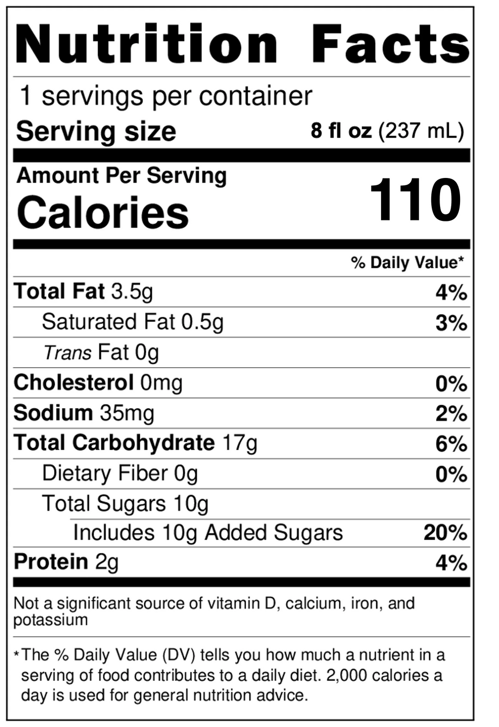 Ingredients: Organic Coffee (Water, Organic Coffee), Oat Milk (Water, Whole Oat Flour), Organic Coconut Sugar, Contains 2% Or Less Of: Sunflower Oil, Potassium Citrate, Natural Flavors, Dipotassium Phosphate, Acacia, Gellan Gum, Sea Salt.