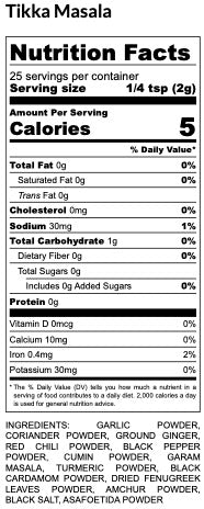 Ingredients: Cumin Seed Powder, Garam Masala, Turmeric, Black Peppercorns, Chaat Party Masala, Red Chili Powder, Kasoori Methi (dried fenugreek leaves), Garlic Powder, Ginger Powder, Black Cardamom Powder, Coriander Powder