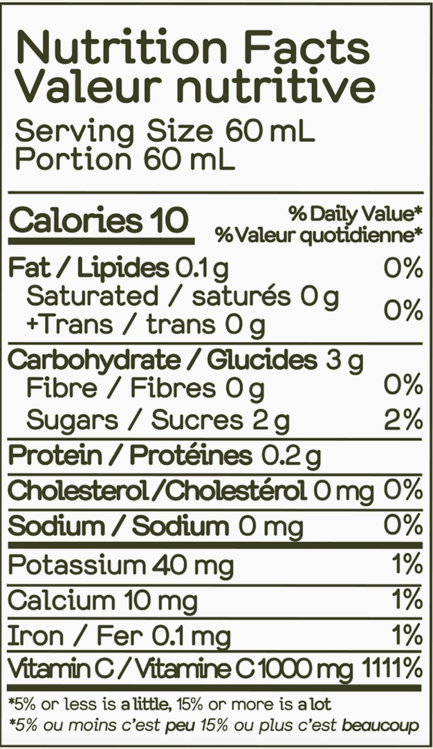 Ingredients: Filtered Water*, Acerola Cherry, Orange, Apple, Fermented Echinacea, Fermented Ginger, Vitamin C*, Sea Buckthorn Berry, Citrus Fibre*, Lemon (*Non-Organic Ingredient)
